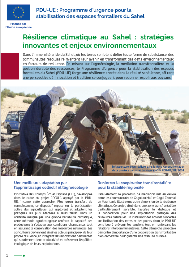 Le document montre comment le Programme PDU-UE a forgé une résilience ancrée dans la réalité sahélienne, offrant une perspective où innovation et tradition se conjuguent pour redonner espoir aux paysa