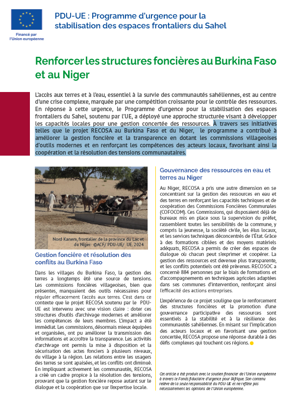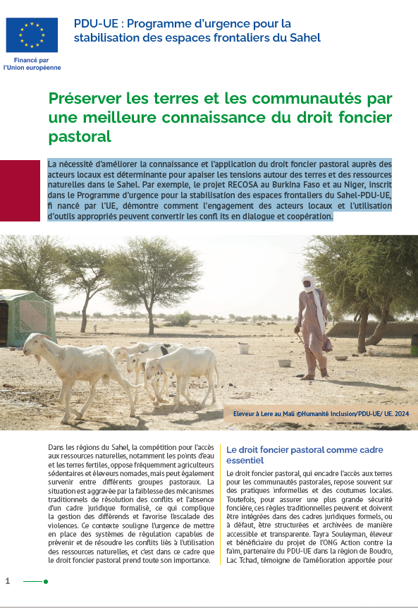 Le programme PDU-UE à travers le projet RECOSA a montré le caractère déterminant de l’amélioration de la connaissance et l’application du droit foncier pastoral auprès des acteurs locaux pour apaiser