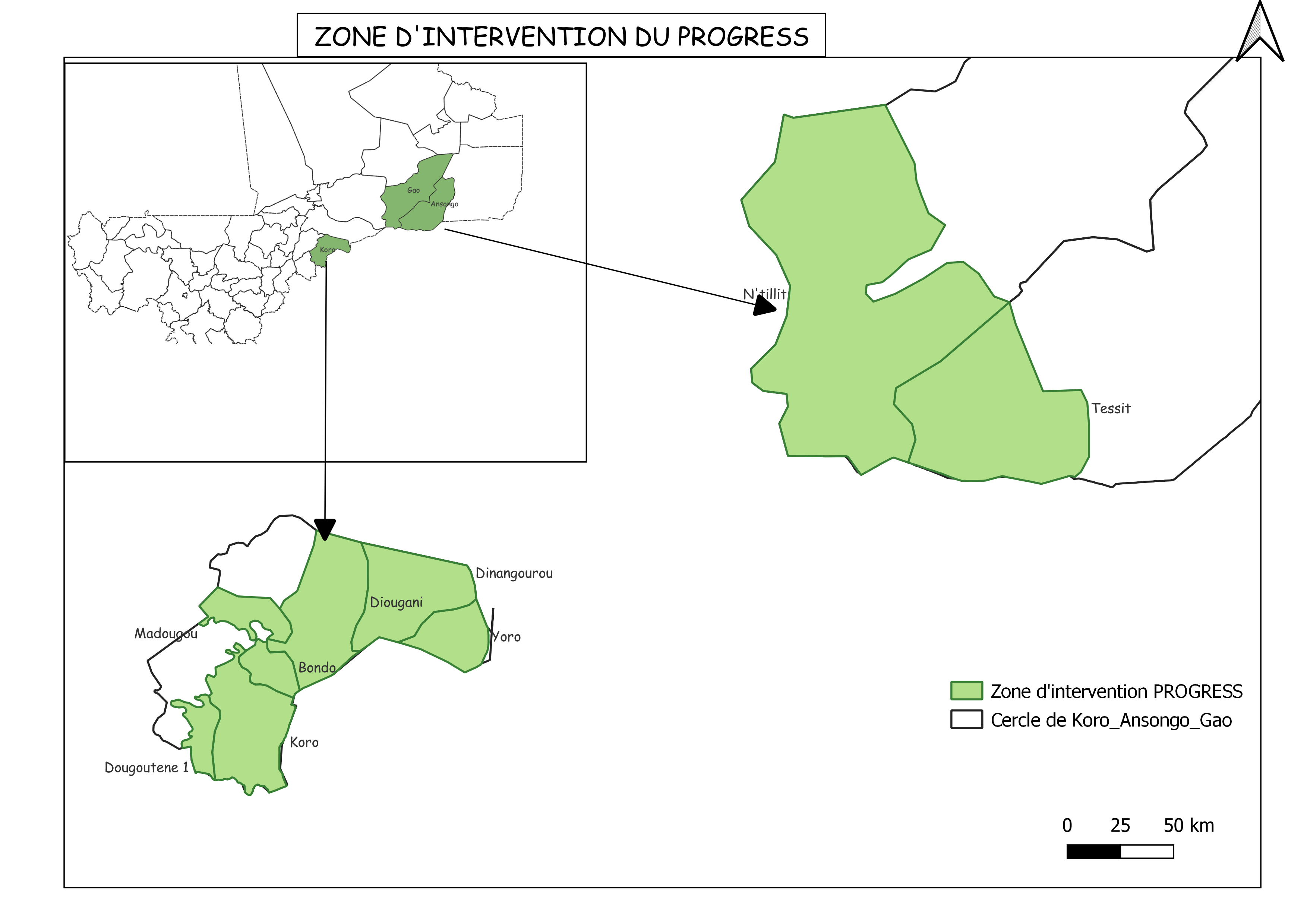 Les 9 communes d'interventions du projet PROGRESS dans les régions du Cercle de Koro, d'Ansongo et de Gao.